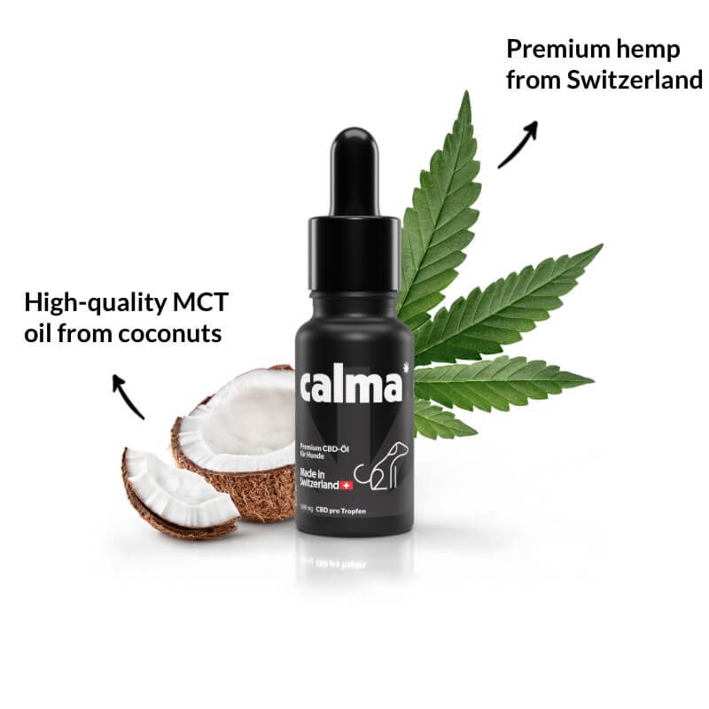 The CBD oil for dogs from CALMA has been specially developed for dogs . Our drops only contain CBD from flowers grown under the highest quality standards for hemp in Switzerland and high-quality MCT oil, which already has many health benefits. Our CBD oil for dogs also contains 0.0% THC and is free of terpenes , so you can be sure that your four-legged friend will only experience positive effects from taking it.